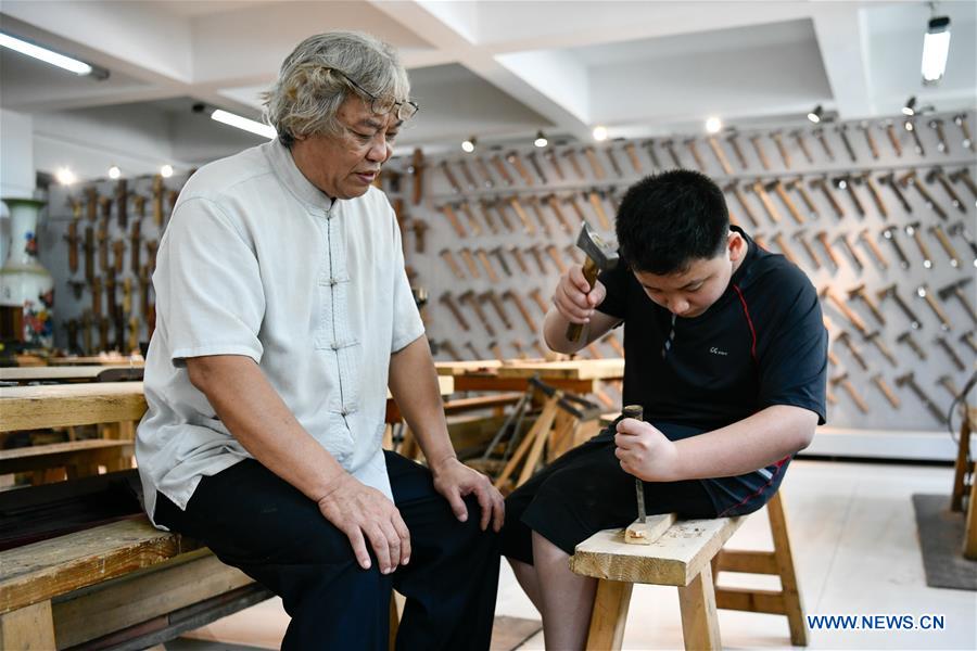 Xin Quansheng teaches his nephew Xin Zhengming at his workshop in Tianjin Vocational Institute, in North China's Tianjin, Aug. 25, 2020. Following the advice of his father, Xin Quansheng started to learn woodworking at the age of 16. Now an intangible heritage inheritor, Xin was once a carpenter for over four decades. During his career, Xin has witnessed both encouraging and frustrating periods of the industry. Nevertheless, he could never forget the feeling of being a carpenter even after he changed his occupation at the hardest time. In September 2019, Xin was invited to teach mortise and tenon techniques and wooden furniture making skills at Tianjin Vocational Institute, which gives him a new opportunity to promote and carry forward the traditional woodworking skills. By far, nearly 100 people from different walks of life have learnt from him.[Photo/Xinhua]
