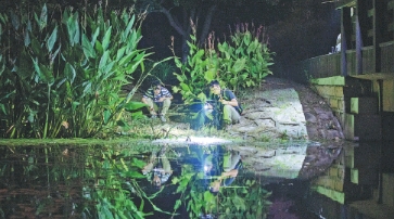 Zhang Wei (R), a researcher at the Shanghai Natural History Museum, and citizen scientists look for frogs tagged with radio transmitters in Century Park in Shanghai. [Photo by Gao Erqiang/China Daily] |