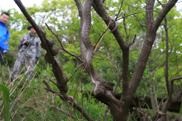 Despite having retired, Sun joined a snake population survey in May. To measure the population density of snakes on the island, Sun captured more than 200 snakes, marked their tails with nontoxic paint and then released them.