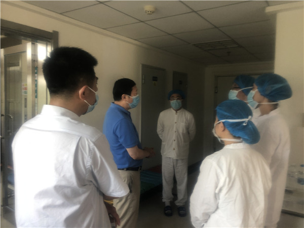 Wang (second left) communicates with medical staff at the hospital. [Photo provided to China Daily] |
