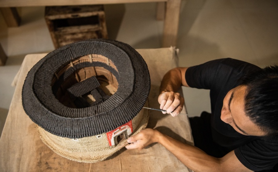 Huang Jiansong cleans and tends to details of a model of an earthenware dwelling on Aug28.[Photo/Xinhua]