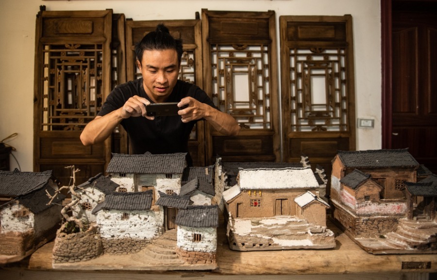 Huang Jiansong uses his mobile phone to shoot a picture of one of his models of earthenware dwellings on Aug28.[Photo/Xinhua]