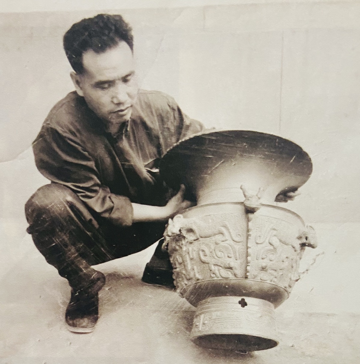 Jia Yubo, the first-generation restorer of the Jia family, examines a bronze vessel. [Photo provided to China Daily]