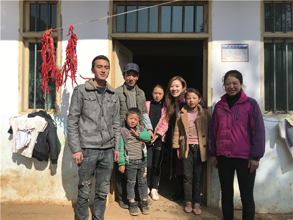 Leung (third from right) is with one of her employees, Zhou Qiao (right), 28, and her family, in front of their house in Hezhang county, Guizhou province. [Photo provided to China Daily] |