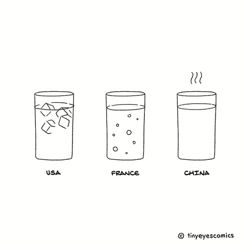 Another culinary difference between Chinese and Westerners is hot water. In her illustration, no matter if it is winter or summer, in a French restaurant, sparkling water is always served before the meal; in the US, the default is usually water with ice; while in China, people drink hot water a lot, because unprocessed tap water is undrinkable and people believe that hot water is good for the health.