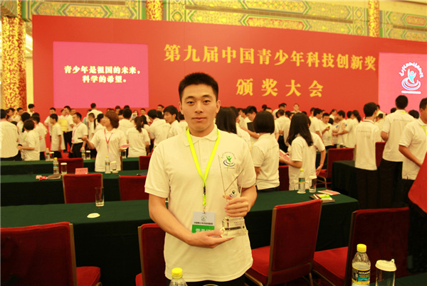 Guo displays a national youth technology innovation award. [Photo provided to China Daily] |