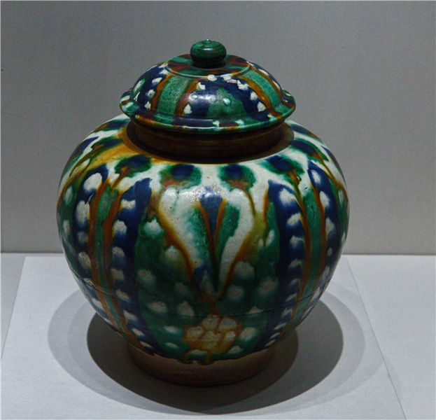 Highlights of the Beijing exhibition include a Tang Dynasty (618-907) sancai bowl with a lid. [Photo by Jiang Dong/China Daily] |