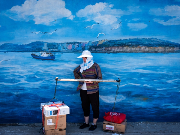 Wang picks up medicine and computer equipment from the dock. Tired on her way, she rests in the shade for a break.[Photo provided to China Daily] |