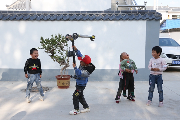 Children play near their new homes at the resettlement site in Lidian village, Lijiadian township of Tongwei county, Gansu province.[Photo by Wu Xiaohui/China Daily] |