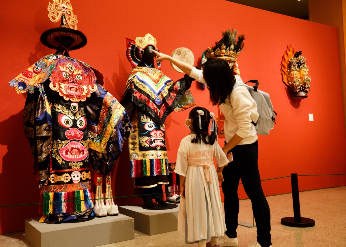 Visitors check the traditional costumes at the National Art Museum of China on Sept, 19, 2020. [Photo by Jiang Dong/China Daily]