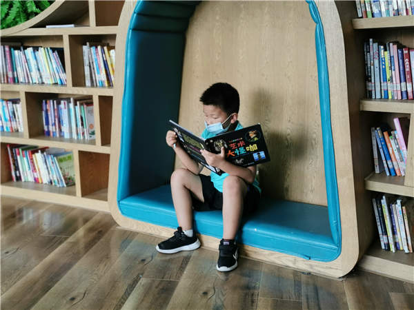 A child reads a book at the reading space. [Photo by Wang Kaihao/China Daily] |