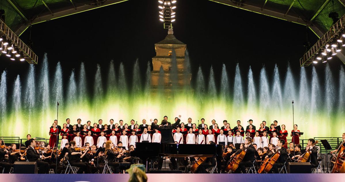 Xi'an Symphony Orchestra gave an online outdoor concert near the iconic Big Wild Goose Pagoda in Xi'an, Shaanxi province on Sept 19, which attracted over 5.6 million viewers. [Photo provided to China Daily]