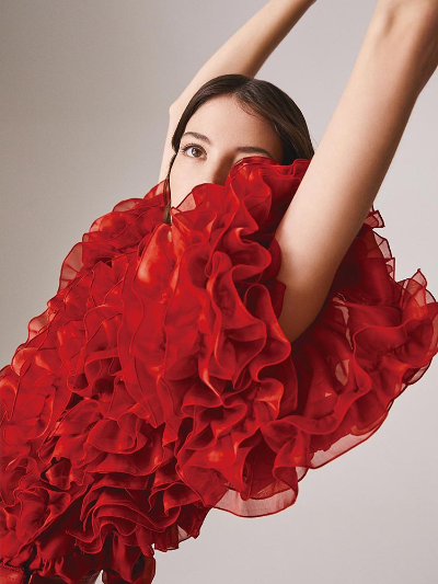 She's sexy, too. There's the obscuring multilayered lotus leaf organza crop top paired with red leather shorts; the short jacket with extensive pleasts on the shoulder paired with an asymmetrical flared woolen skirt and net yarn; the snugly wrapping short jacket to go with clean-cut woolen cigarette trousers; and the sheer blouse coupled with a one-side-pleated velvet skirt. Be it the interesting contour of a wide-top-slim-bottom or a slenderly straight contour, the waistline is always accentuated with a belt.