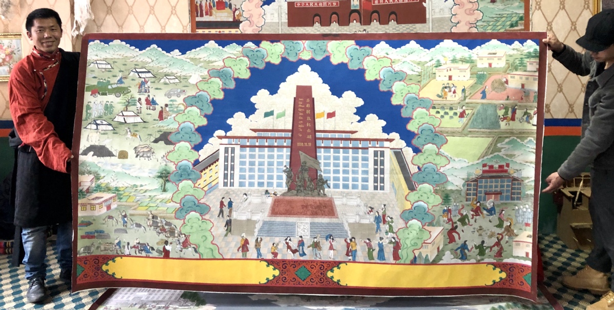 Last year, with financial support from the county's cultural bureau — an investment of 2.4 million yuan — 11 thangka masters in the county worked together to create seven large thangka with a variety of content, including an image of Beijing's Tian'anmen Square, a giant portrait depicting China's 56 ethnic groups and stories of people fighting COVID-19.