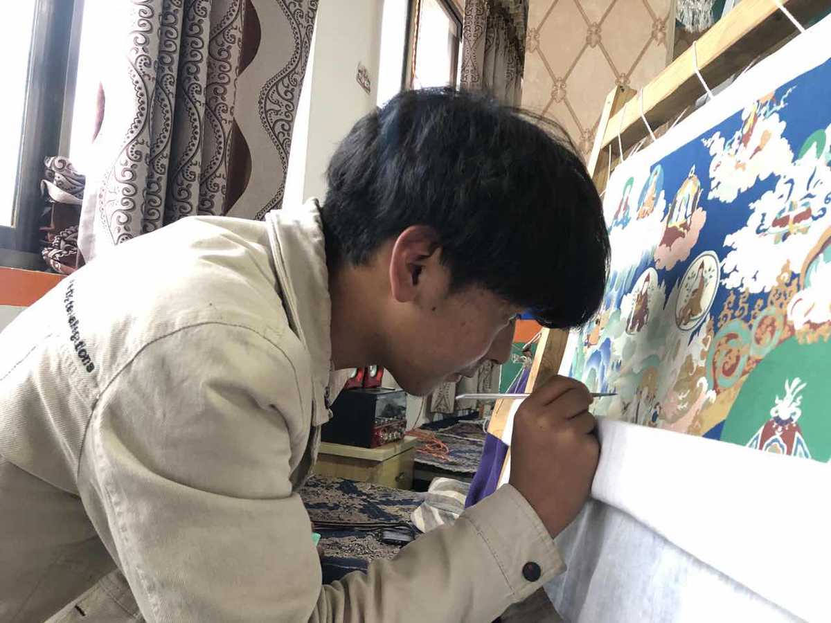 Artists work on a thangka at a cooperative in Tibet’s Gojo county. [Photo by Palden Nyima/ chinadaily.com.cn]