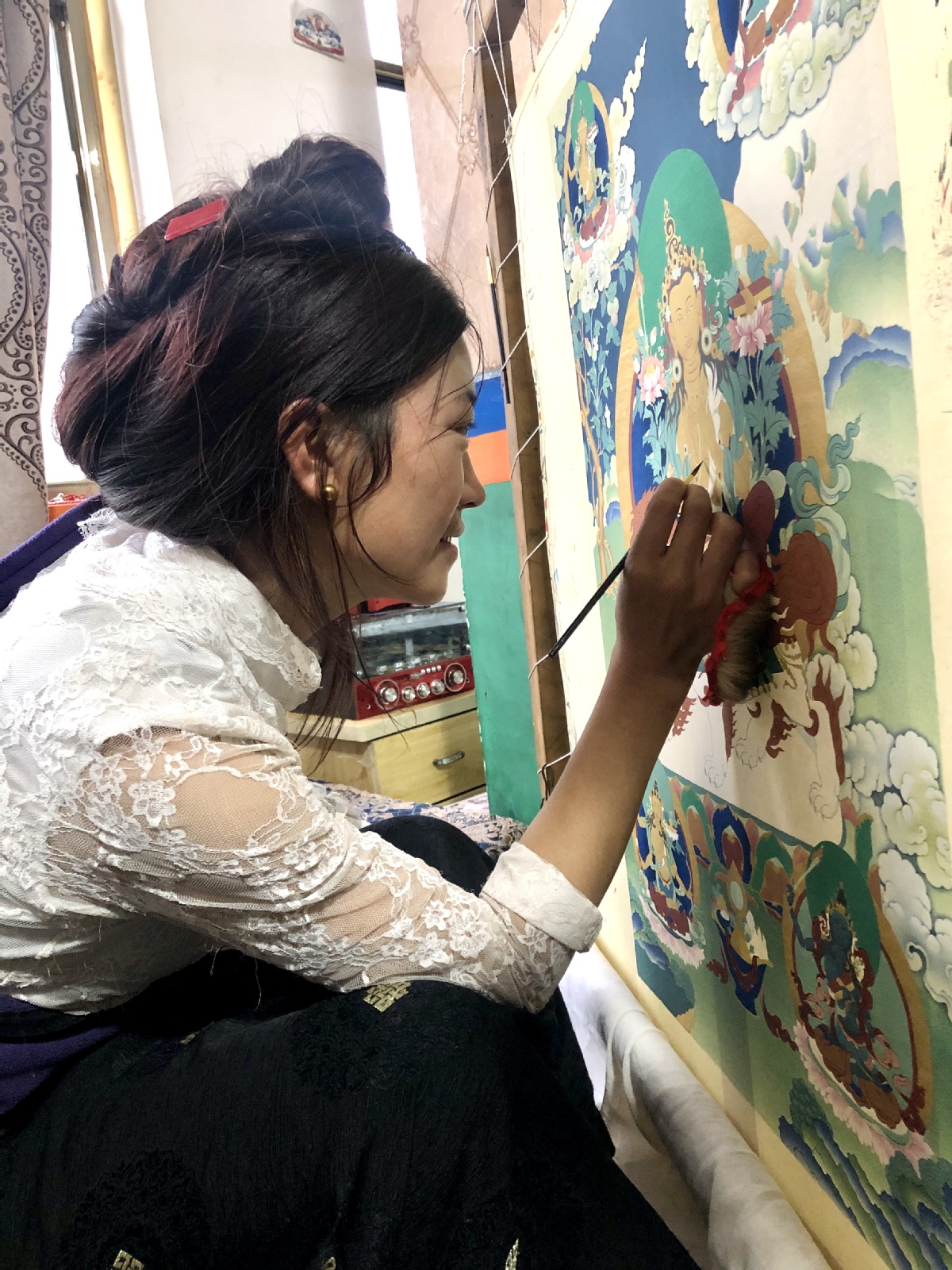 Artists work on a thangka at a cooperative in Tibet's Gojo county. [Photo by Palden Nyima/ chinadaily.com.cn]