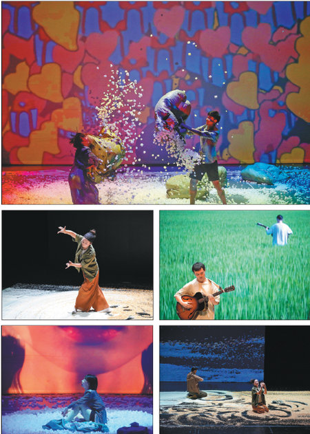 Top and above left: Jiang Fan acts as an internet celebrity in her last dance drama Web Traffic. Center two and above right: Nourishing Life, an experiment dance project supported by the Youth Incubation Platform, was performed at Shanghai International Dance Center Theater on Sept 18.[Photo provided to China Daily] |