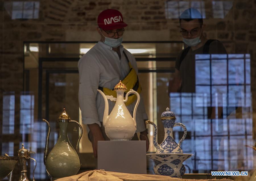 Visitors look at exhibits during an exhibition of Chinese porcelain at the Topkapi Palace Museum in Istanbul, Turkey, on Oct 2, 2020. A nearly 12,000-piece collection of Chinese porcelain is on display in the Topkapi Palace Museum, revealing an uninterrupted historical chronology of the evolution of Chinese porcelains from the 13th to the 19th century.[Photo/Xinhua] |