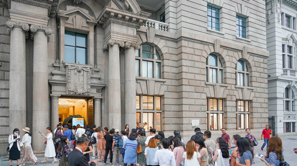 Visitors wait in a line in front the Bund One Art Museum in downtown Shanghai for the exhibition, Impression Sunrise. CHINA DAILY |