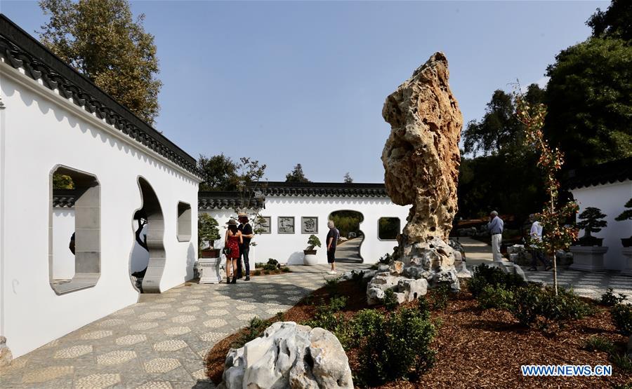 People visit the traditional Chinese garden Liu Fang Yuan, or the Garden of Flowing Fragrance, in Los Angeles County, California, US, on Oct 9, 2020. [Photo/Xinhua]