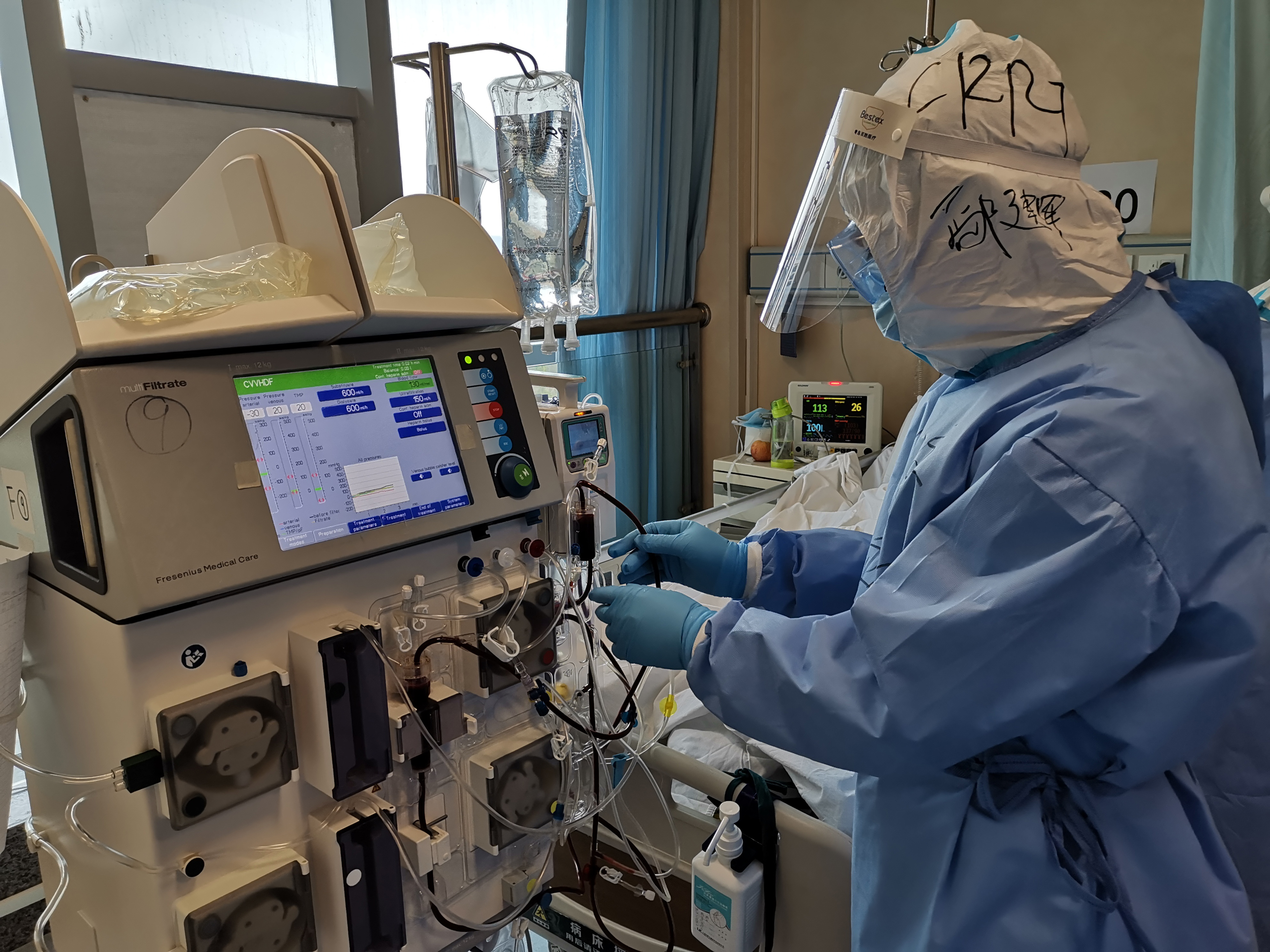 A member of the nephrology team conducts blood purification for a patient in severe condition.[Photo/Xinhua] |