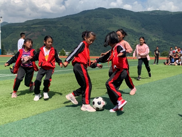 Girls play soccer at Tiedaobing Hope School in Puge county, Liangshan Yi autonomous prefecture, Sichuan province.[Photo by Fang Aiqing/China Daily]