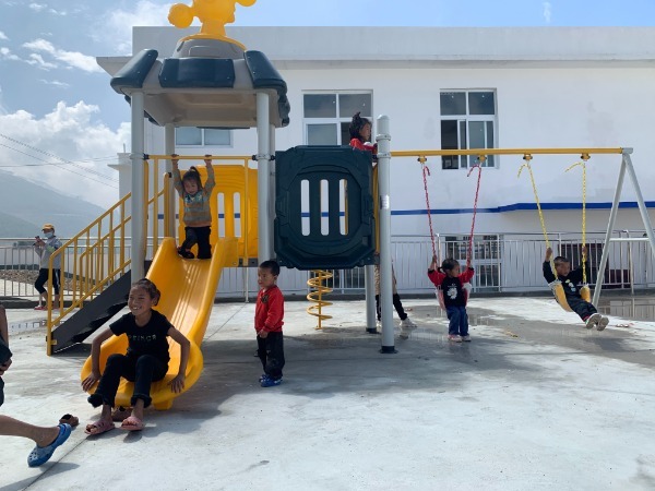 Children in Zhongba village, Xide county, Liangshan, play on the swings and the slide for the first time in the village's kindergarten.[Photo by Fang Aiqing/China Daily] |