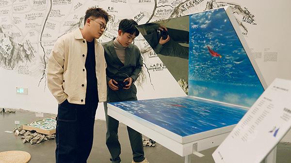 Pop duo Good Meimei, consisting of Zhang Xiaohou (left) and Qin Hao, write and perform a new song, titled Aquarium in Pink, which is included in the art project, titled All Creation: Encounter with Animals, unveiled at the UCCA Center for Contemporary Art in 798 Art Zone in Beijing on Oct 15. [Photo provided to China Daily] |