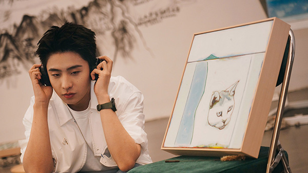 Singer-songwriter Jiao Maiqi listens to the song, Cat or Human, he writes and performs, which is paired with the art piece, White, by Chinese artist Tang Yongxiang. [Photo provided to China Daily] |