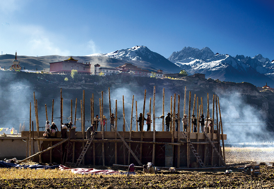 Tibetans build a new house in a village in Ganzi Tibetan autonomous prefecture, Sichuan province, on Oct 13, 2013. The per capita income in rural areas of Tibet increased by 10.2 percent year-on-year in the first six months of 2020. [Photo by Li Longde/China Daily]