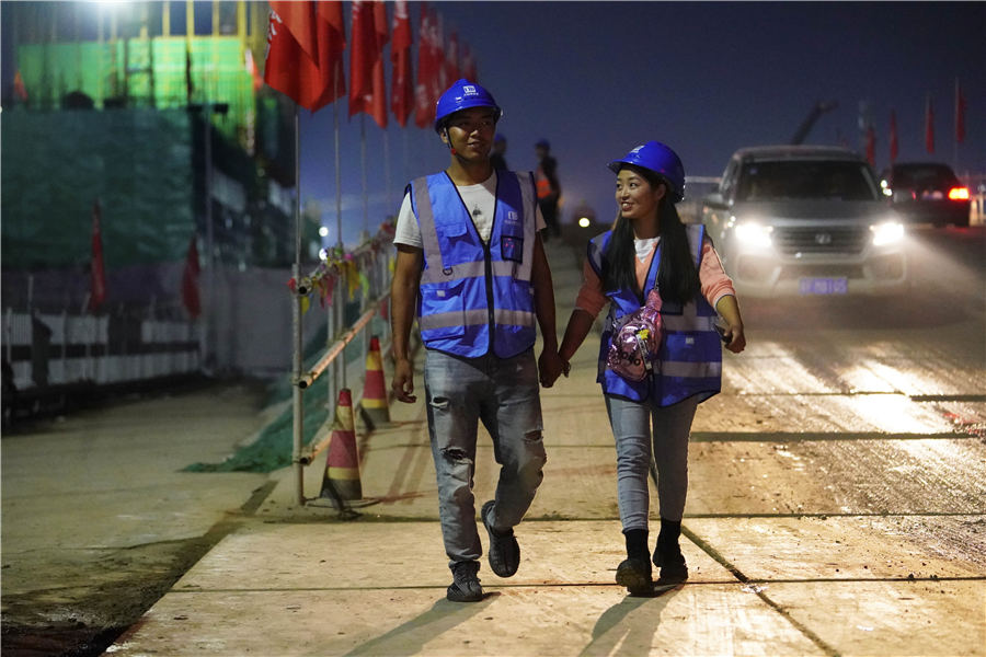 Jina Xiaohu and Aluo Chunmei walk around the resettlement housing project site after work. [Photo by Xing Guangli and Mou Yu/For China Daily] |