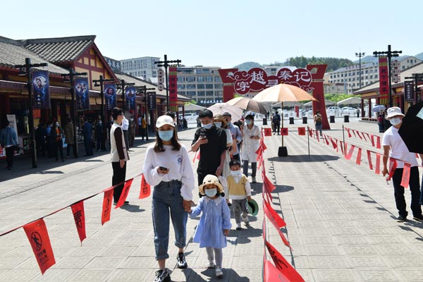 Tourists line up to have their temperature taken and health app checked before entering a scenic spot featuring a Qin Dynasty-style palace at Hengdian World Studios in April. [Photo provided to China Daily]
