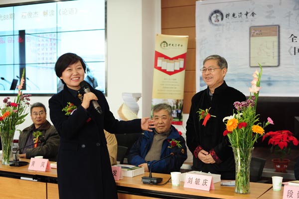 Club founder Fu Xiaoping (front left) introduces Liu Yuqing, vice-president of the China Society for the Study of the Book of Songs, and other guests at a book launch event in the club. [PHOTO BY ZHAO XIANGLONG/FOR CHINA DAILY] |