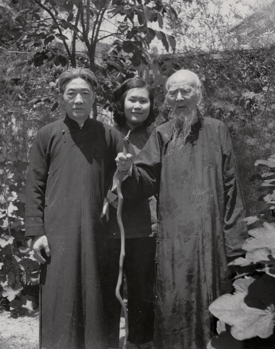 A photo taken in 1948 shows Xu Beihong (left), his wife Liao Jingwen and Qi Baishi. [Photo provided to China Daily]