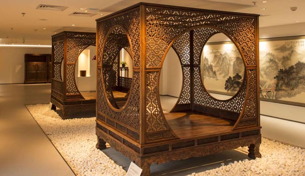 In the bed exhibition area, there is a huanghuali bed with six pillars carved like bamboo.