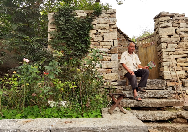 A local resident rests in front of his renovated house in Zhujialin.[Photo by Cheng Yuezhu/China Daily]