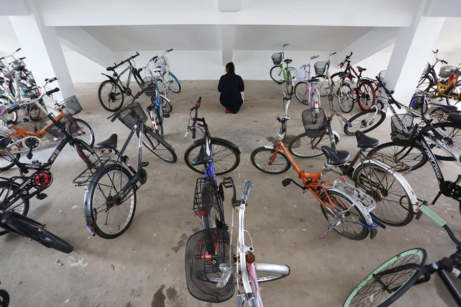 A girl studies under the staircase of a library in Anqing, Anhui. [Photo by Chen Dong/for China Daily]