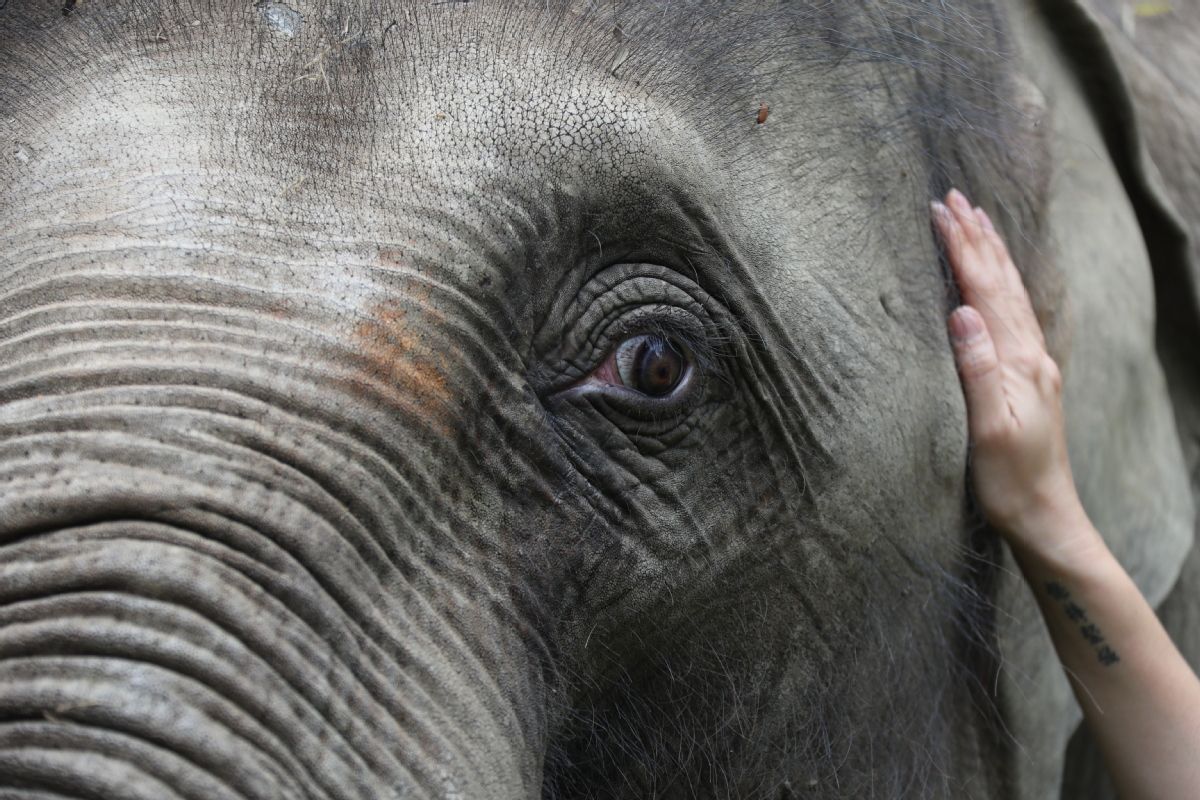 Xiong Chaoyong pets an elephant at the Asian Elephant Breeding and Rescue Center in Xishuangbanna, Southwest China's Yunnan province. [Photo by Wang Jing/China Daily]