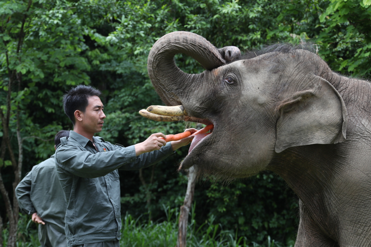 Xiong Chaoyong feeds an elephant carrots at the Asian Elephant Breeding and Rescue Center in Xishuangbanna, Southwest China's Yunnan province. [Photo by Wang Jing/China Daily]