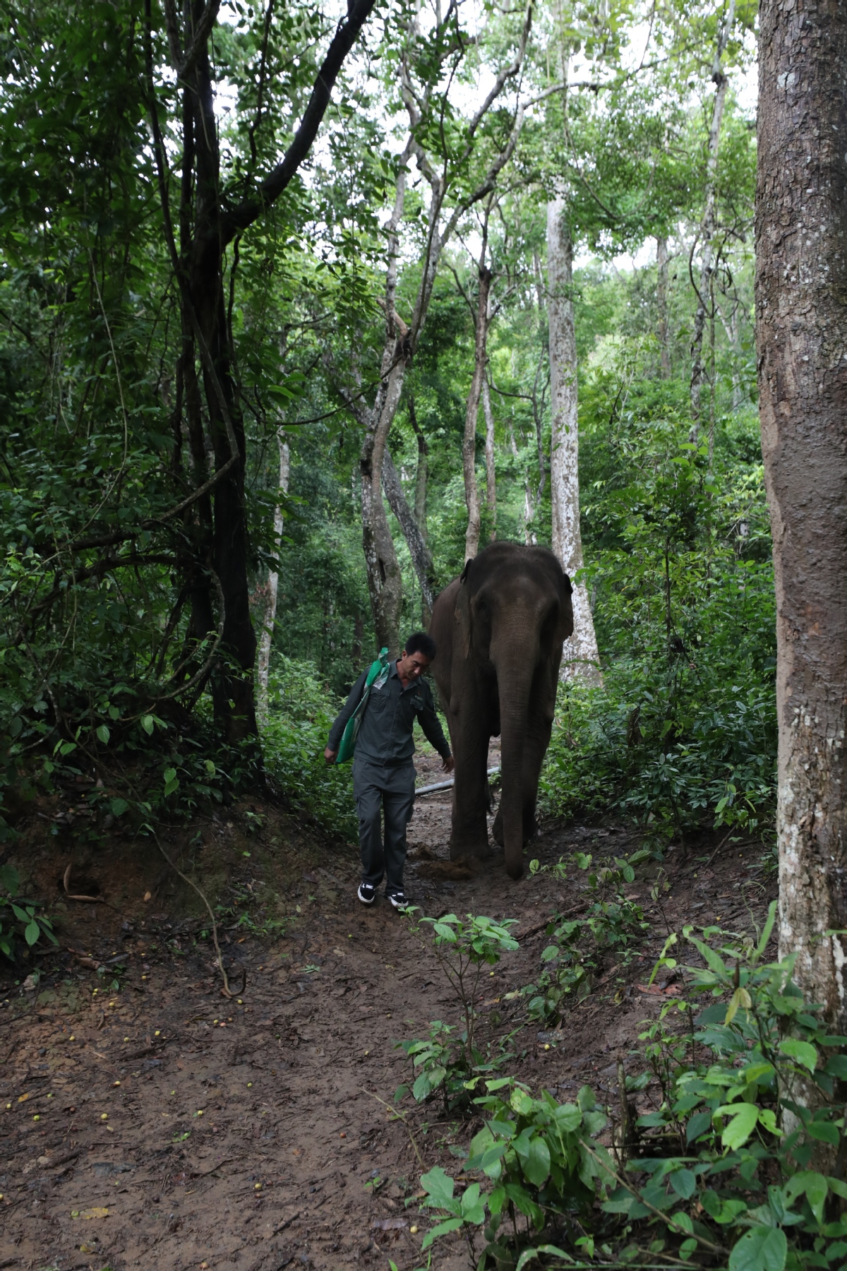 Xiong Chaoyong walks with an elephant at the Asian Elephant Breeding and Rescue Center in Xishuangbanna, Southwest China's Yunnan province. [Photo by Wang Jing/China Daily]