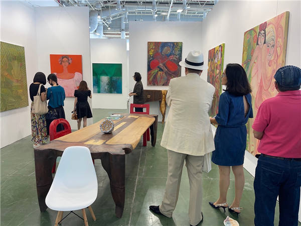 Visitors view artist Kong Ning's oil paintings on display during the Art Xiamen 2021 in Xiamen city, Fujian province, June 17, 2021. [Photo provided to chinadaily.com.cn]