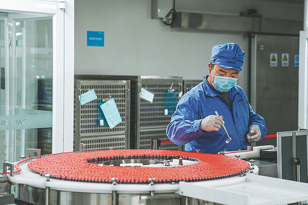 The staff work on a production line at Sinovac Biotech's factory in Beijing.PENG ZIYANG/XINHUA