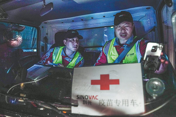 After taking a break in the Baoding service zone in Hebei province, the drivers Lu Yanhui (left) and Liu Si take turns driving.PENG ZIYANG/XINHUA