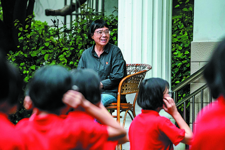 Zhang Guimei watches the freshmen exercise at class break. [Photo/Xinhua]