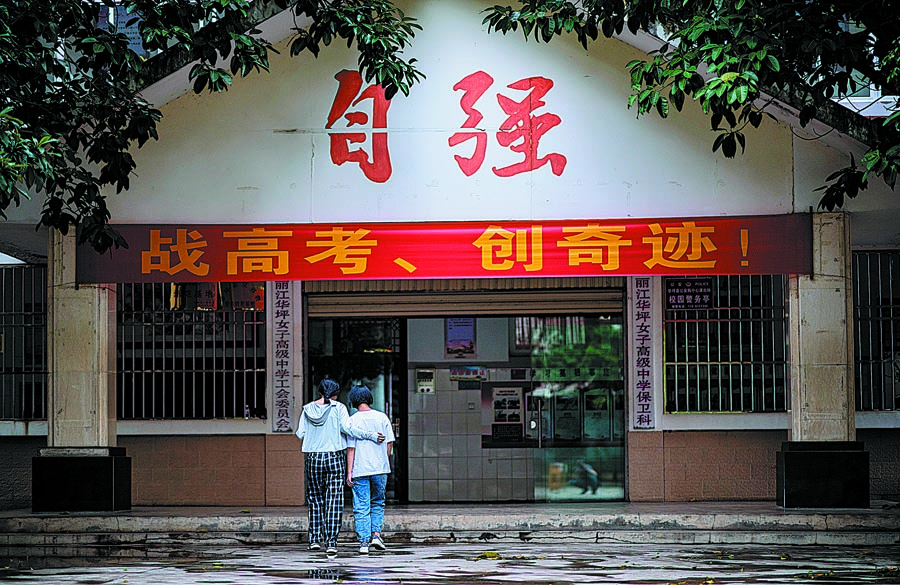 Yang Limei (right) walks with her teacher. [Photo/Xinhua]