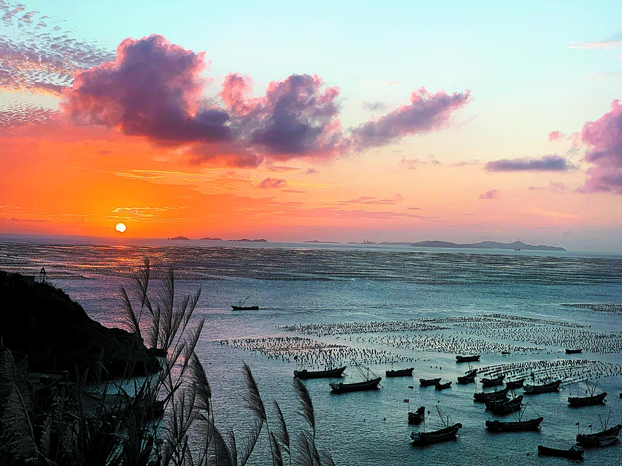 We would undertake this one-and-a-half-hour ritual by first going to the largest mussel breeding center on Gouqi Island. We climbed up a col on the island, facing the sea, said to be one of the best spots for sunset gazing, and were able to see white foam floating all over the sea. From a distance, the foam boxes for cultivating mussels looked like sea pearls. The sun's rays turned the previously blue sea into a blazing canvas of red hues, a landscape painted with the most affirmative brushstrokes.