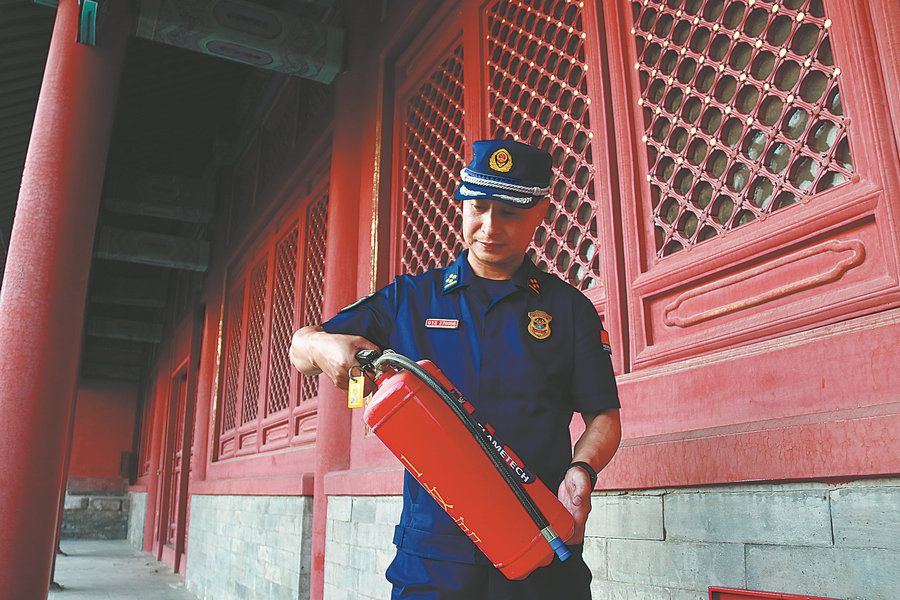 Patrolling is their main daily work. Cai and his colleagues patrol the 0.72-square-km museum every day to check if there are any potential risks, like visitors throwing cigarette butts near trees or into garbage bins, and if the firefighting devices, including 168 fire hydrants and more than 4,000 fire extinguishers, are in good condition.