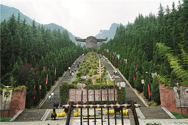In Shennong Altar Scenic Area, a long stone ladder leads to a 21-meter-high stone sculpture of Shennong's head-with two ox horns, he closes his eyes with his chin up, as if he's lost in thought.