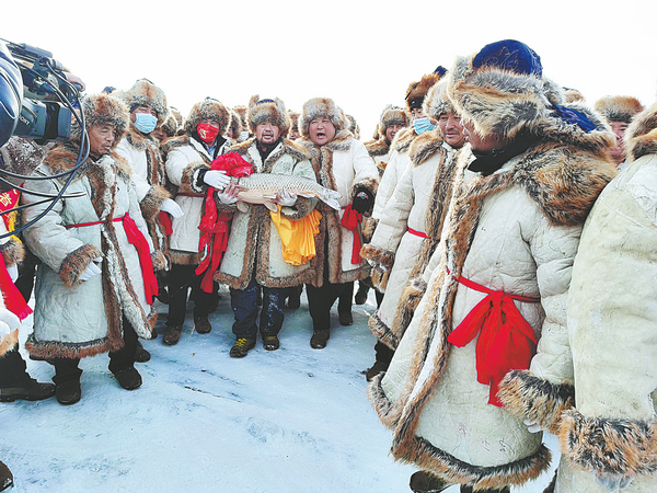 Local fishermen in Fuhai county, Northwest China's Xinjiang Uygur autonomous region, gather together to catch fish from the frozen Ulungur Lake during the county's fifth winter fishing festival on Saturday.