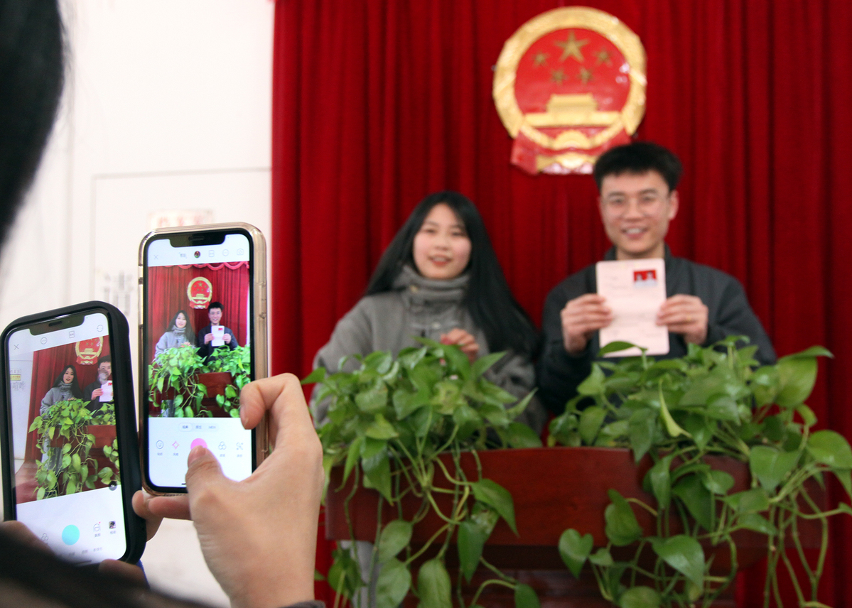 Newlyweds pose for pictures after getting their marriage certificates in Jiaozuo, Henan province, on Feb 22, 2022. [Photo by Cheng Quan/For China Daily]